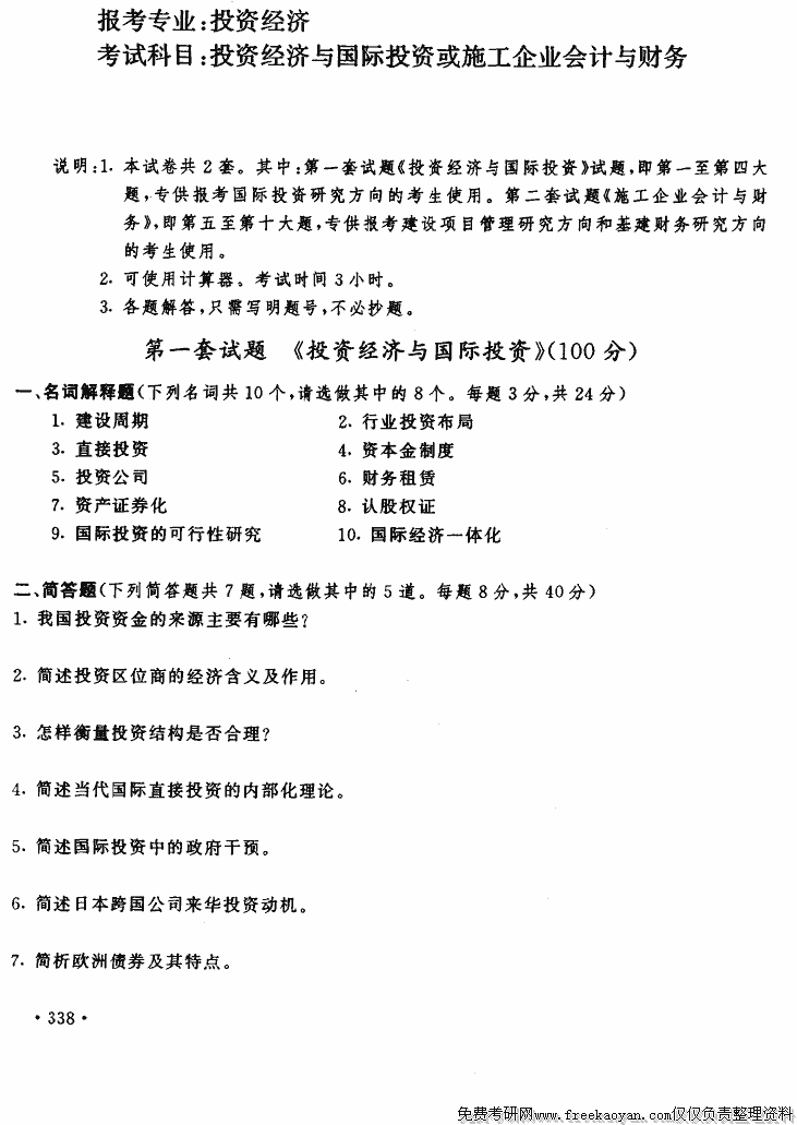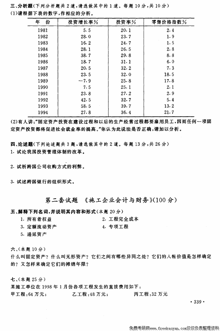 上海财经大学1998年考研真题-投资经济与国际投资或施工企业会计与财务