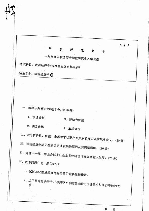 专业课考研经验 本站小编 FreeKaoyan 2018-01-22华东师范大学1999年考研真题-政治经济学