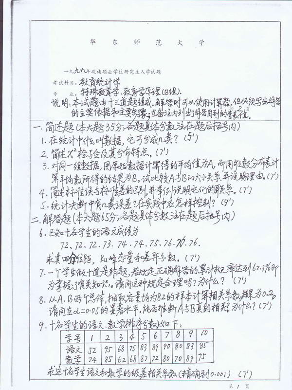 专业课考研经验 本站小编 FreeKaoyan 2018-01-22华东师范大学1999年考研真题-心理统计与测量