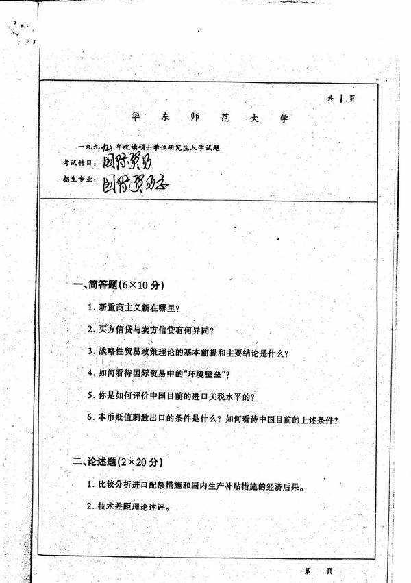 华东师范大学1999年考研真题-国际贸易