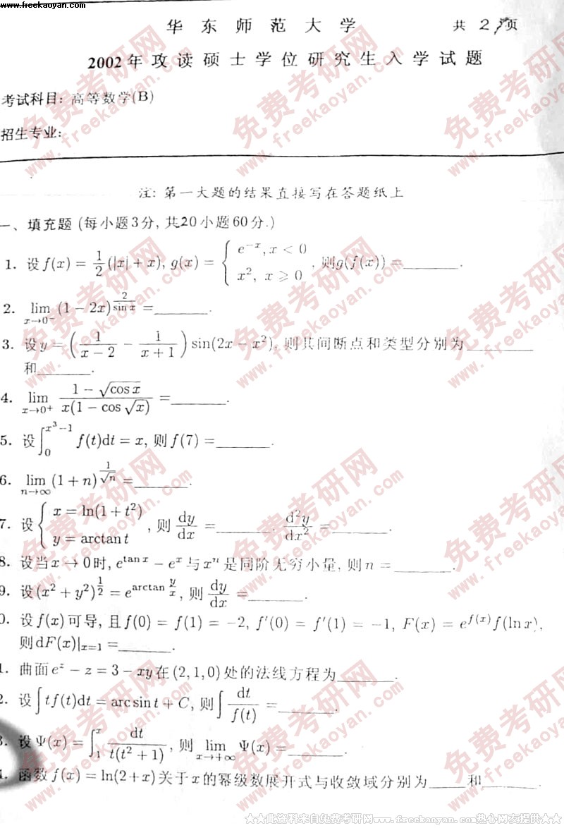 华东师范大学2002年考研真题-高等数学B