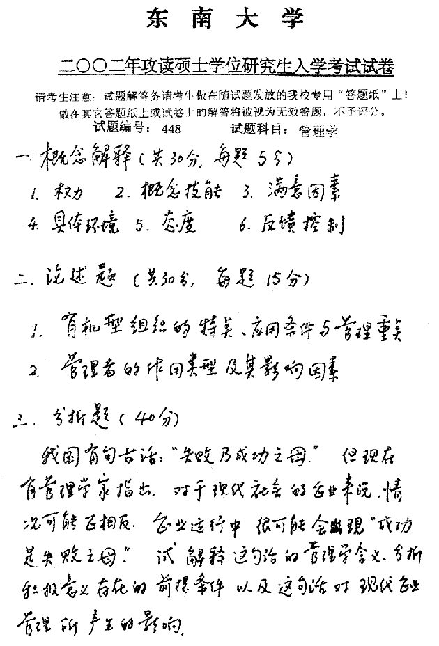 专业课考研经验 本站小编 FreeKaoyan 2018-01-222002一名词解释⒈“霍桑实验”及基本结论⒉整分合原理⒊安德森的公共决策论⒋中国的行政区划⒌一长制与委员会制⒍行政管理中的经济方法二简答题⒈简析行政组织结构中职位、权力、责任的涵义及相互关系⒉行政计划一般包括哪些层次与形式⒊行政管理学的行为主义研究方法主要有哪些特征⒋简述美国最早的三本著名的行政学教 ...