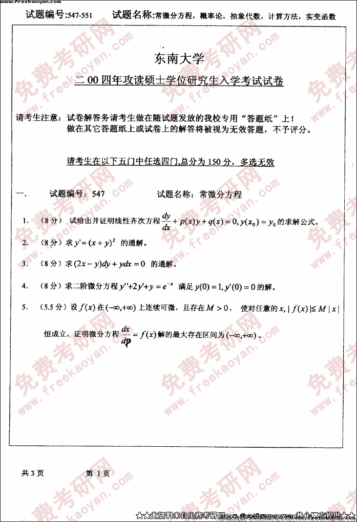 东南大学2004年考研真题-常微分方程