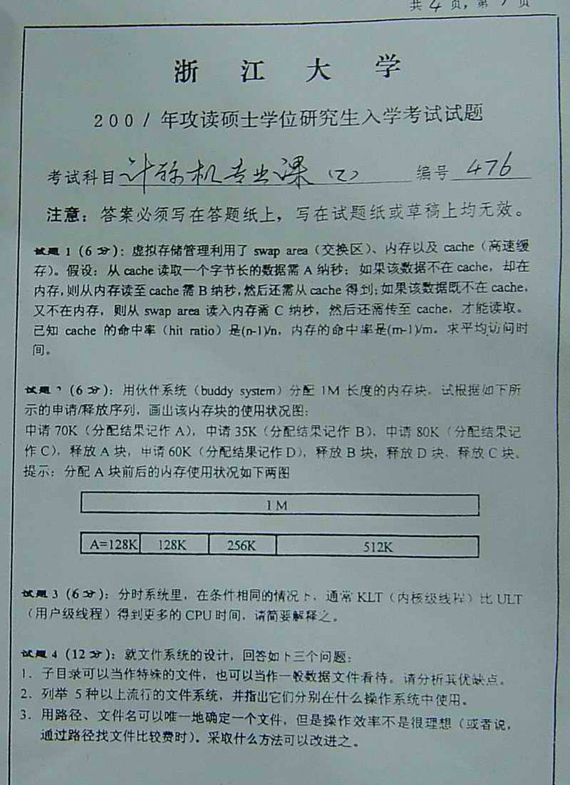 浙江大学2001年考研真题-计算机专业课乙