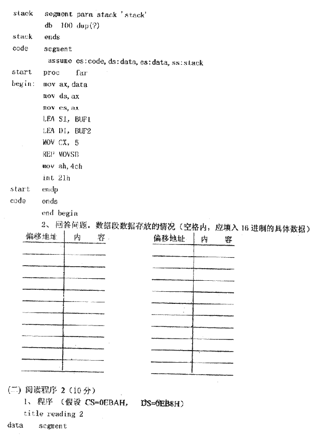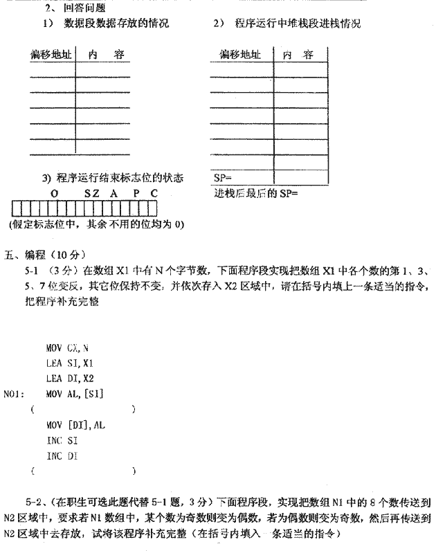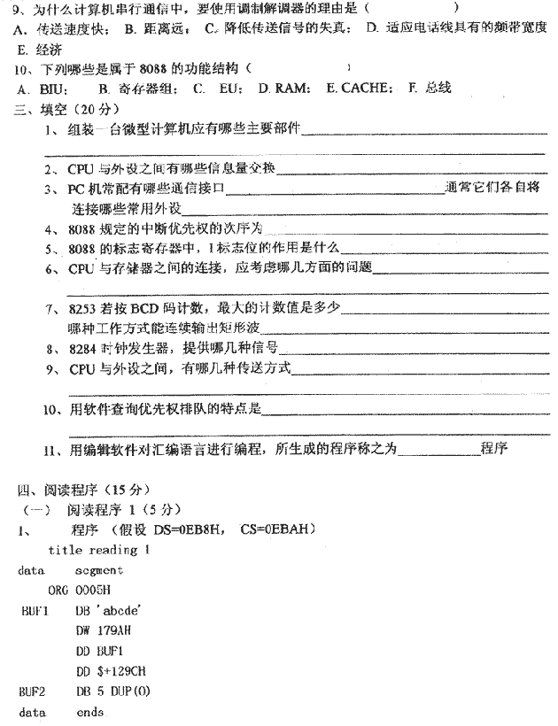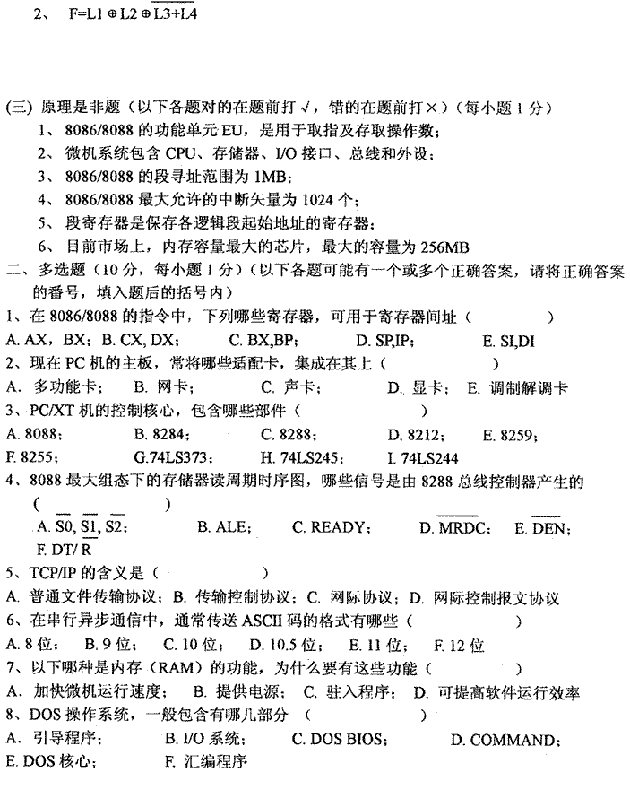 2000年微机原理与数字电路试题 注:应届生作所有不加*的题,往届生可在加*号题与不加*号同题号题中任选一题。一、 单项选择题(共10分)从每小题的四个备选答案中选出一个正确答案,并将正确的番号填入题干的括号内。1, 计算机使用总线结构的优点是便于实现积木化,同时()。1) 减少了信息传输量2) 提 ...
