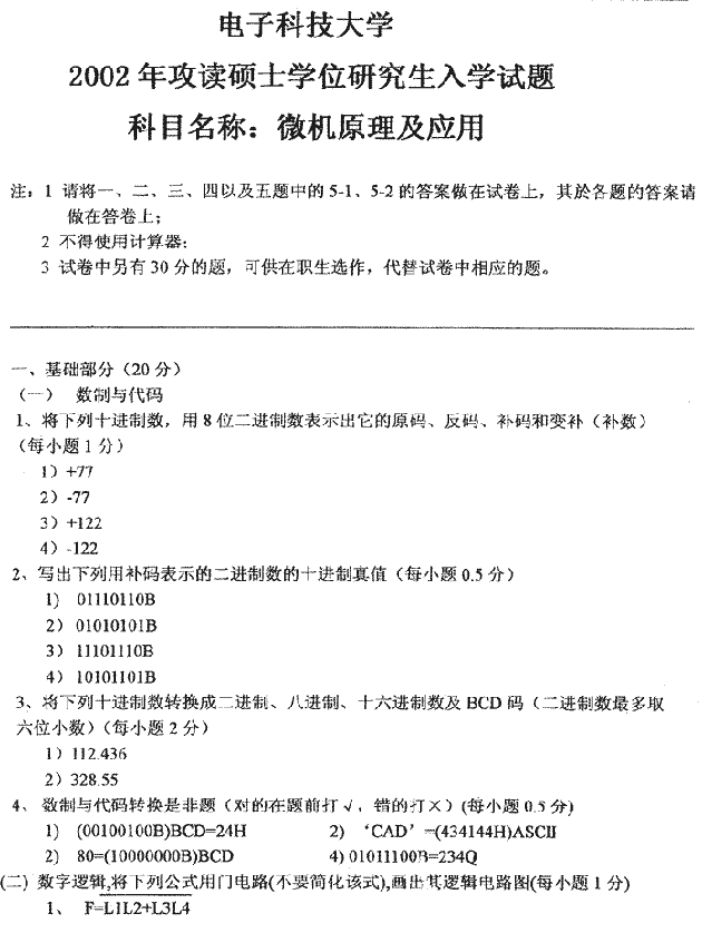专业课考研经验 本站小编 FreeKaoyan 2018-01-22电子科大1999微机原理与数字电路试题 考试科目:微机原理与数字电路 注:应届生作所有不加*的题,往届生可在加*号题与同序号不加*号题中任选一题。 一、单项选择题(共10分)从每小题的四个备选答案中,选出一个正确答案,并将正确答案的番号填入题干的括号内。 1、 从8086CPU的内部结构上看,其是由 ...
