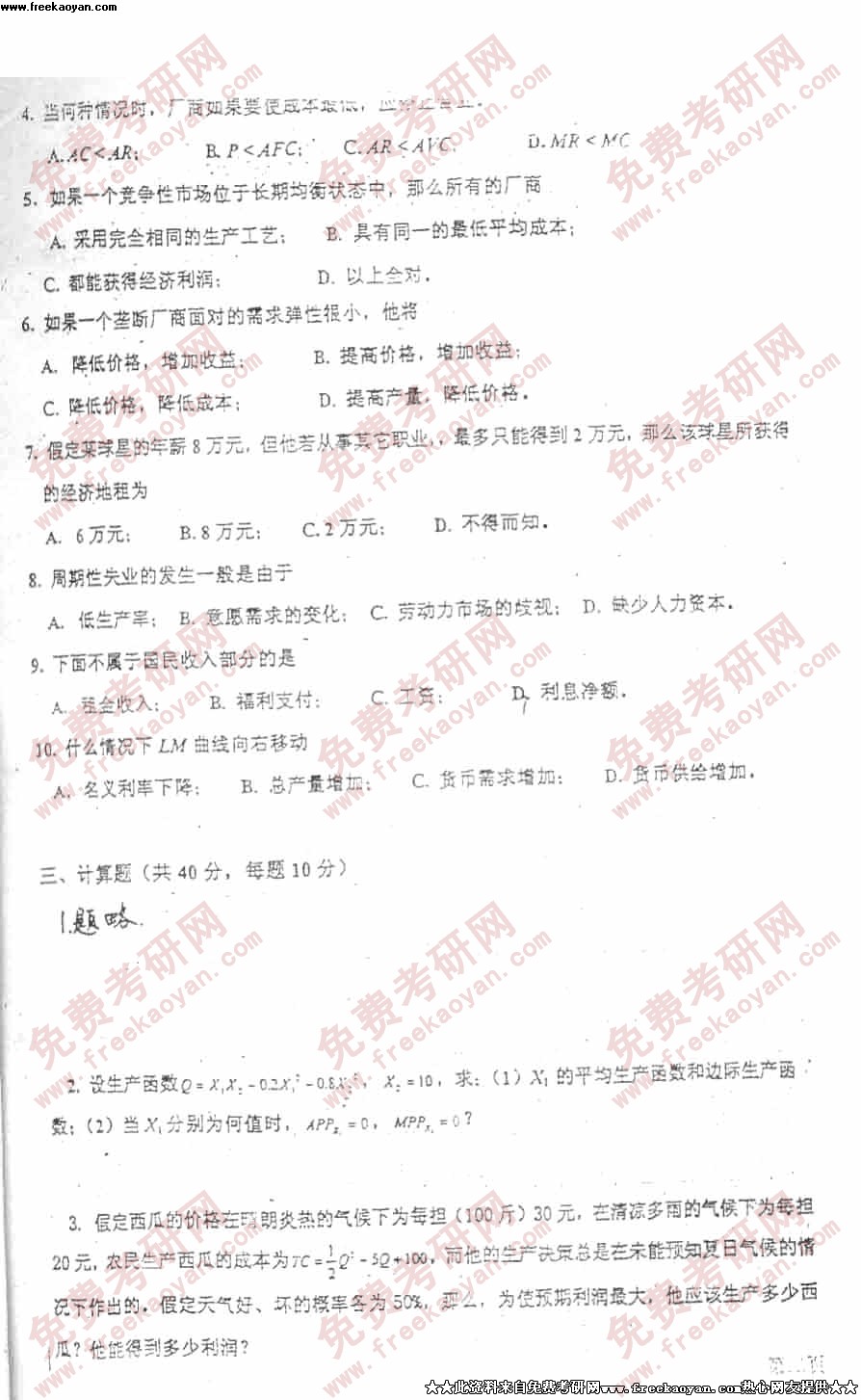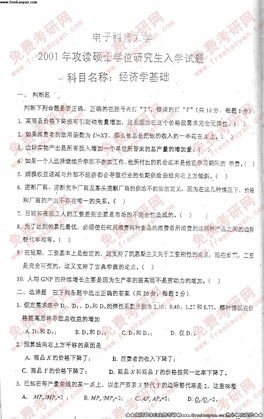 电子科技大学2001年考研真题-经济学基础试题