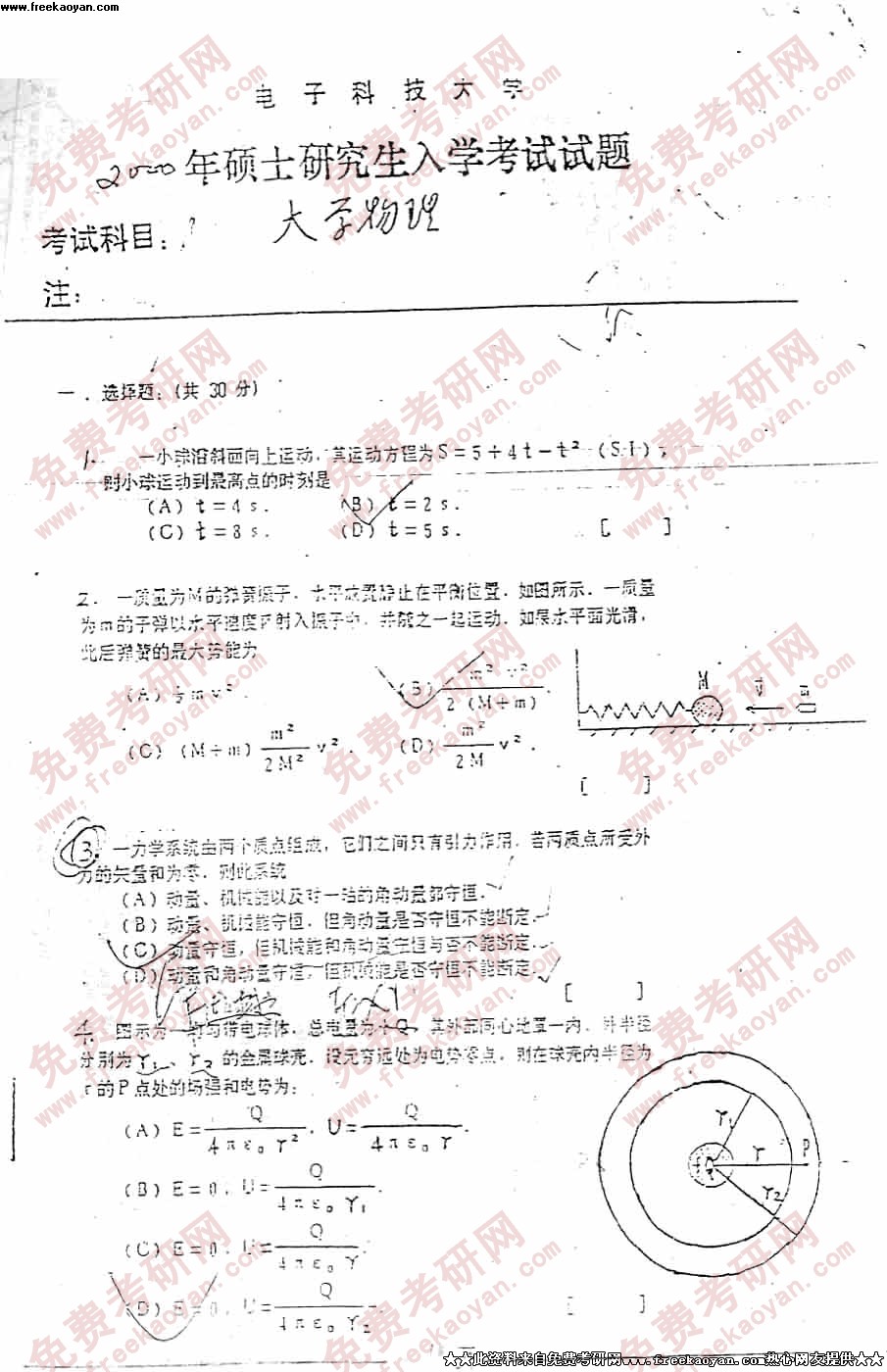 电子科技大学2000年考研真题-大学物理试题