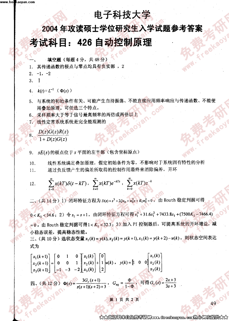 电子科技大学2004年考研真题-自动控制原理答案