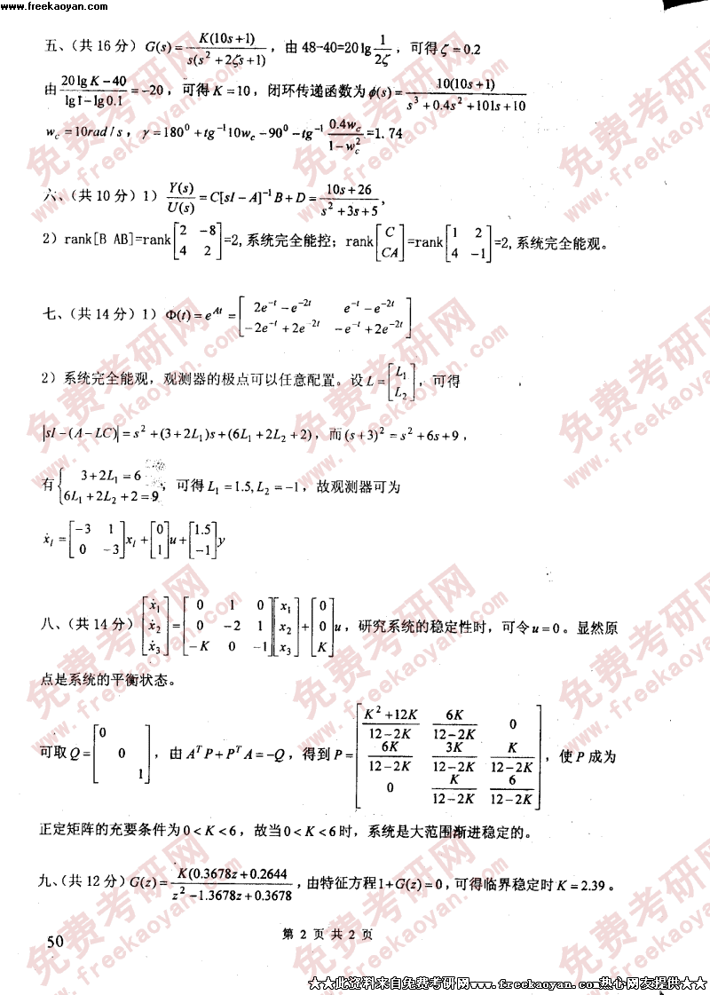 电子科技大学2002年考研真题-控制工程试题答案