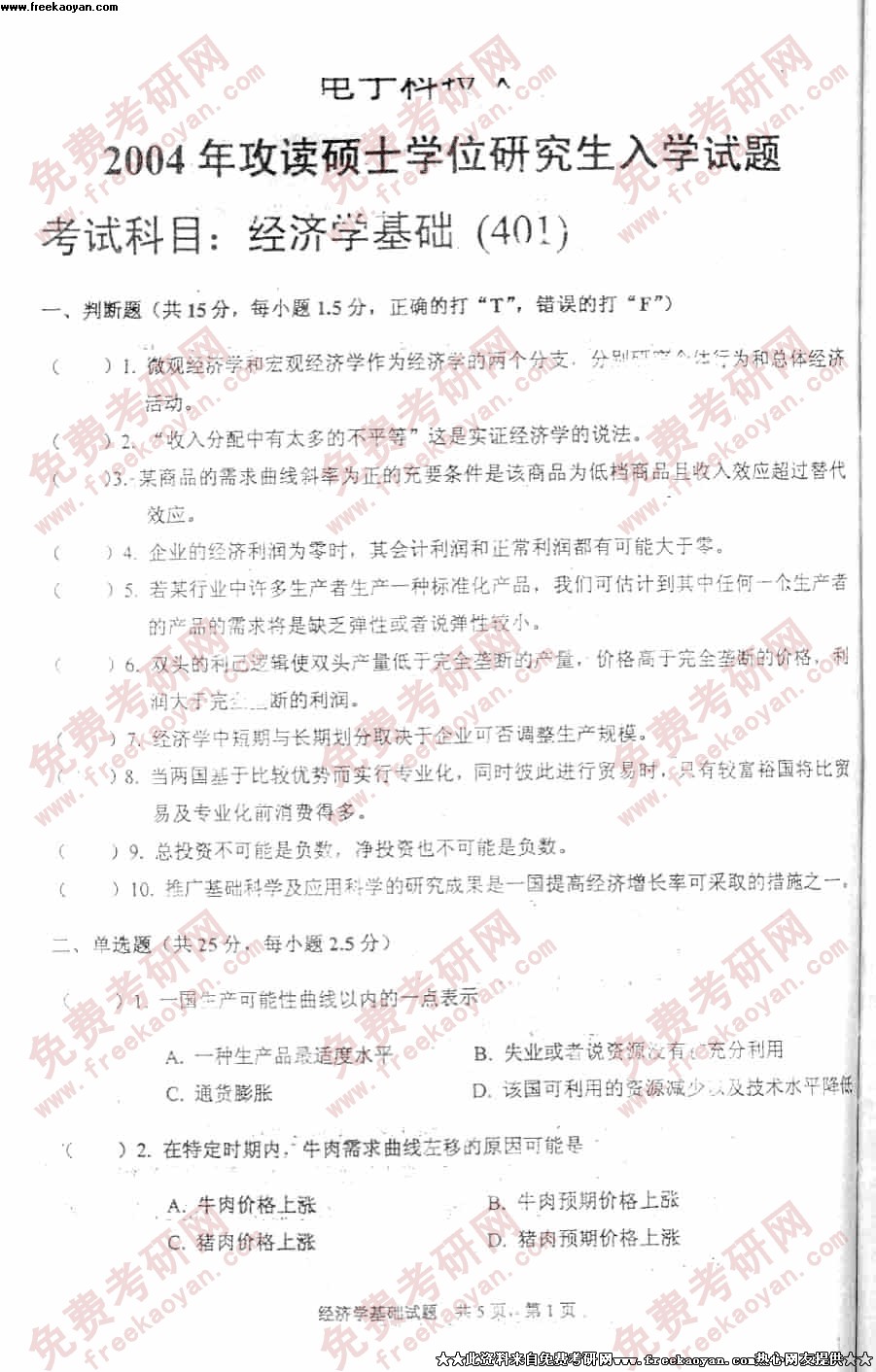 电子科技大学2004年考研真题-数字电路和模拟电路试题