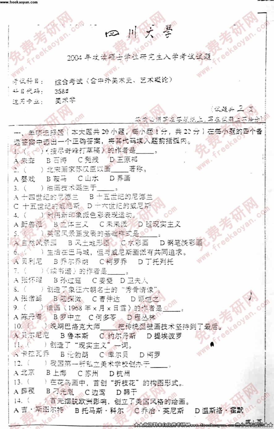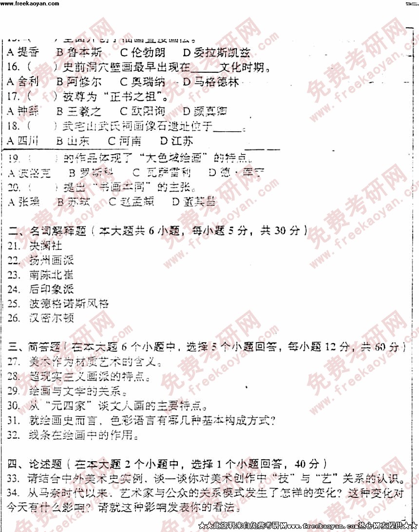 专业课考研经验 本站小编 FreeKaoyan 2018-01-221998年试题一. 词语解释(每题4分,共20分)1.“内在的尺度”;2. 通感;3. 悲剧性; 4.创作方法与文艺思潮; 5.艺术概论二. 简答题(每题10分,共40分)1.毛泽东在《讲话》中对文艺与社会生活的关系作出了什么样的论述?你对此的观点有何看法和评价?2.你是怎样看待“三一律”的?3.恩 ...