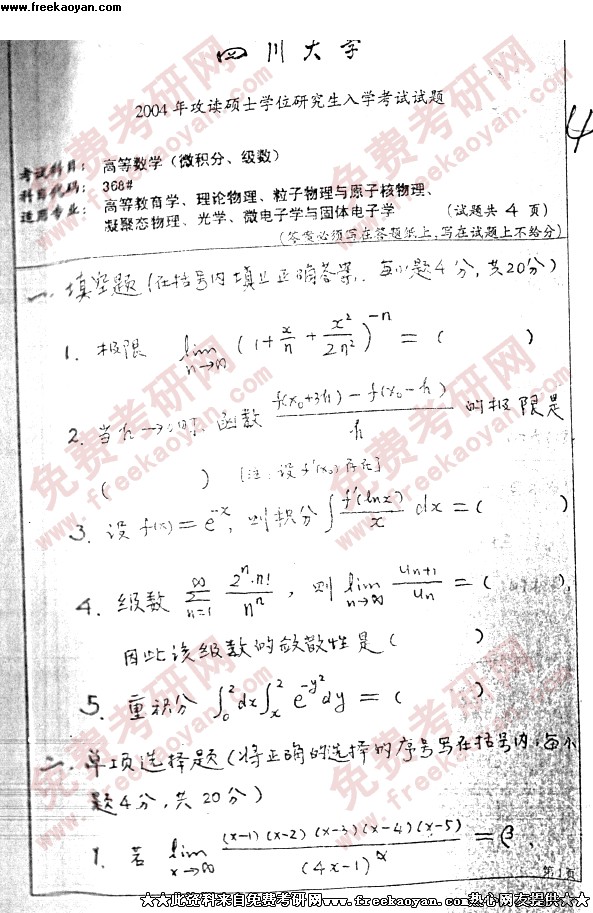 四川大学2004年考研真题-理论物理--高等数学1