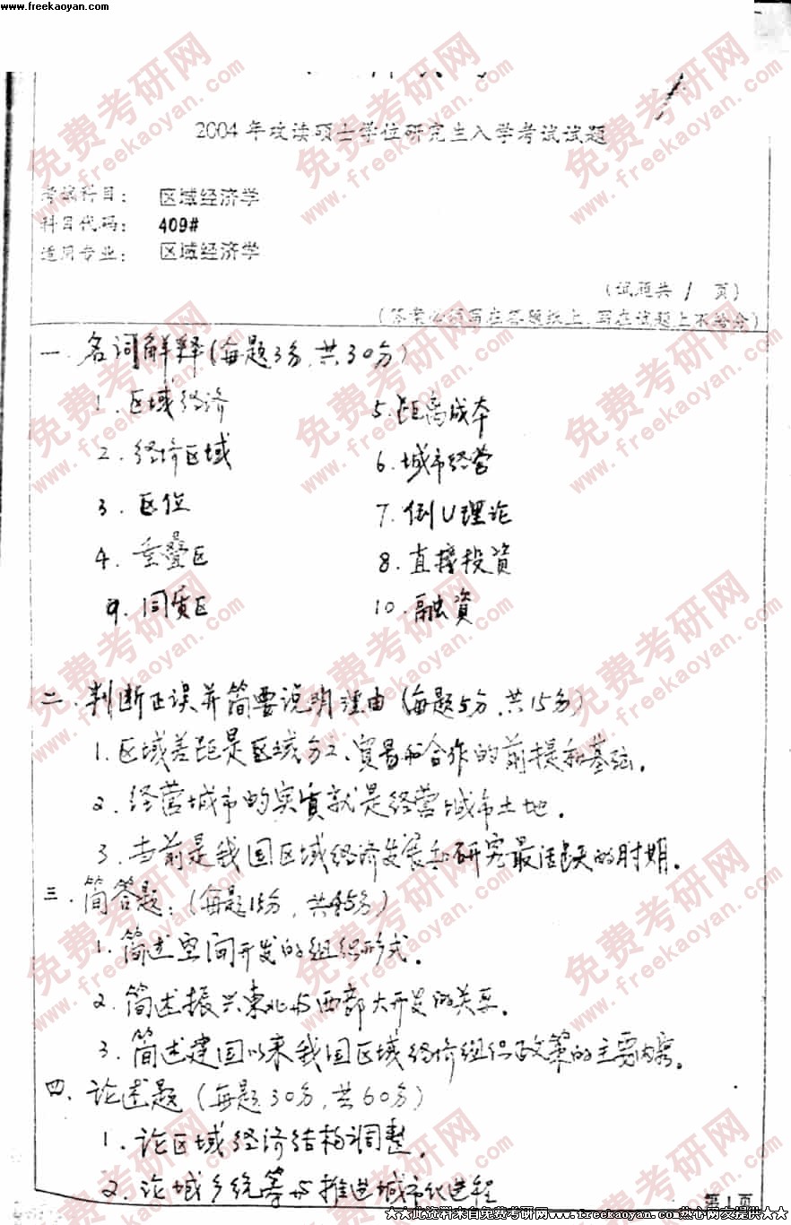 四川大学2004年考研真题-区域经济学试题