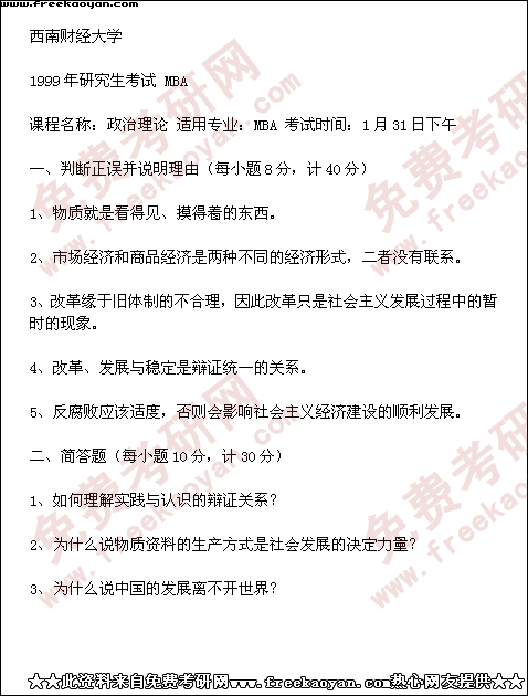 专业课考研经验 本站小编 FreeKaoyan 2018-01-22西南财经大学2000年考研真题-综合考试(政治经济学、世界人口)