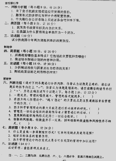 西南财经大学1999年考研真题-综合考试(货币银行学、管理学)