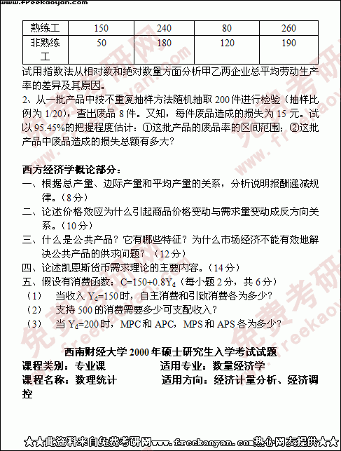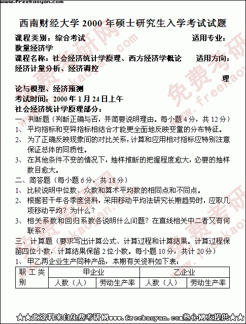西南财经大学2000年考研真题-数量经济学