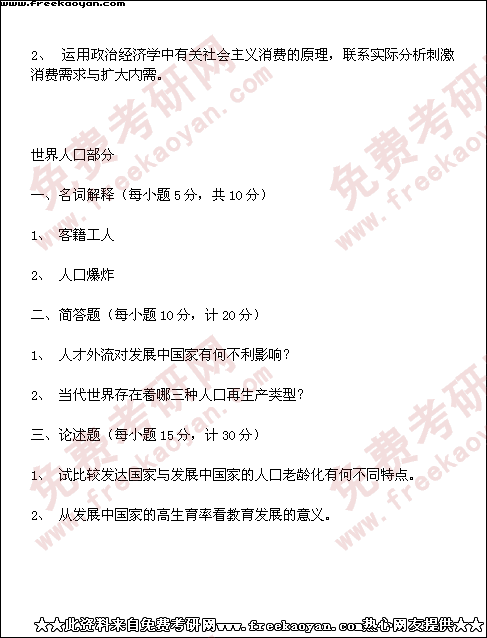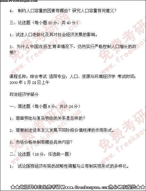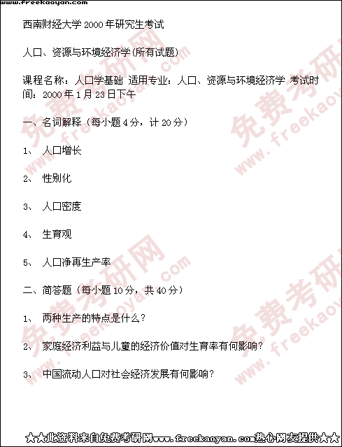 西南财经大学2000年考研真题-人口、资源与环境经济学(所有试题)