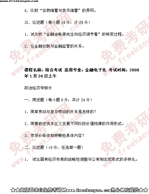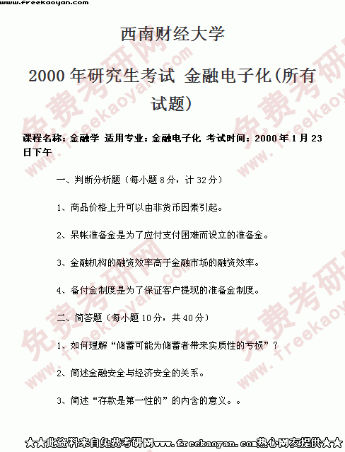 西南财经大学2000年考研真题-金融学(货币方向所有试题)