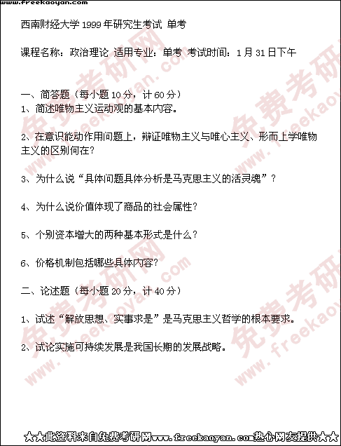 西南财经大学1999年考研真题-政治理论(单考)