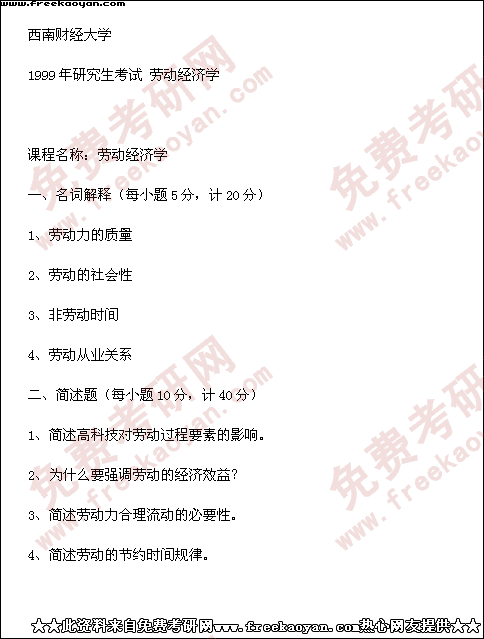西南财经大学1999年考研真题-劳动经济学
