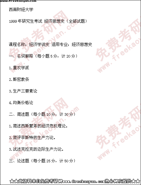 西南财经大学1999年考研真题-经济思想史(全部试题)