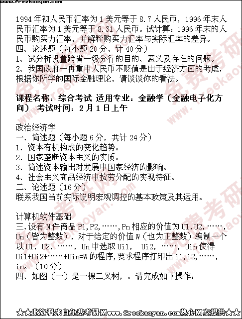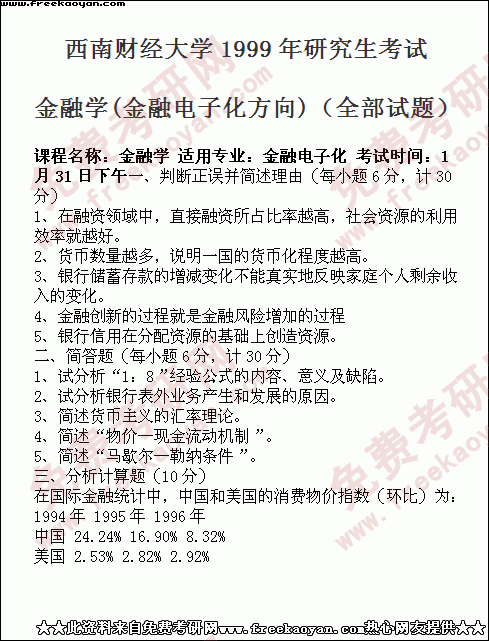 西南财经大学1999年考研真题-金融学(金融电子化方向)(全部试题)