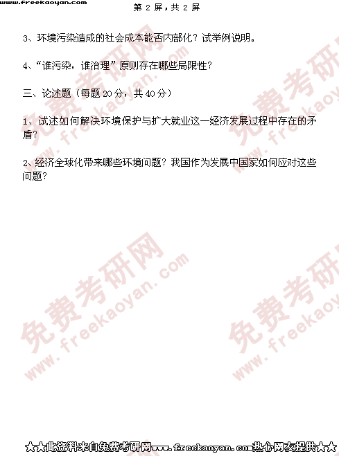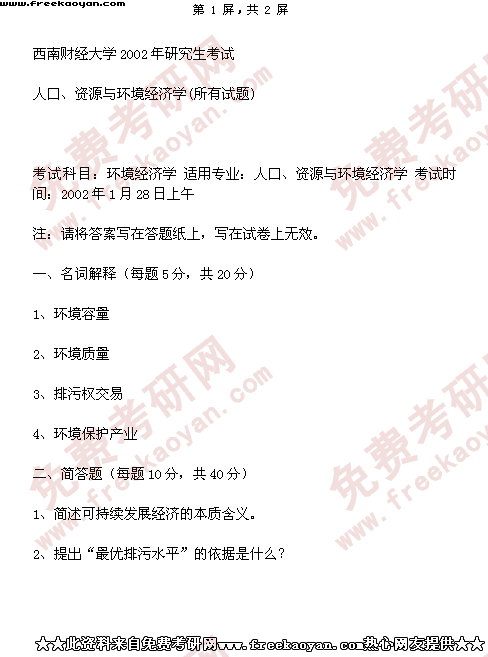 西南财经大学2002年考研真题-人口、资源与环境经济学(所有试题)