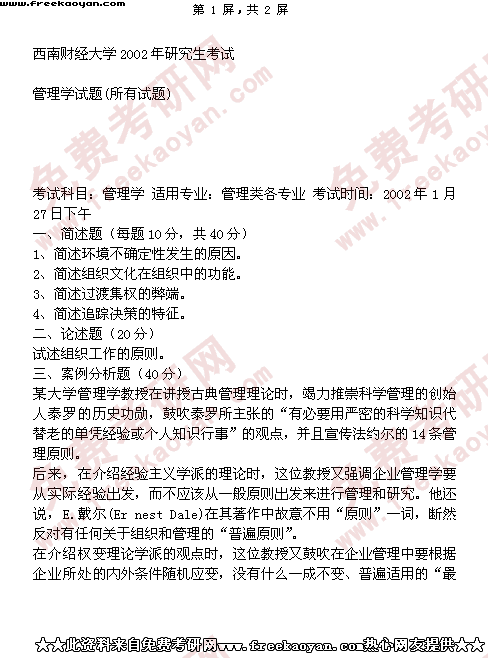 西南财经大学2002年考研真题-管理学试题(所有试题)