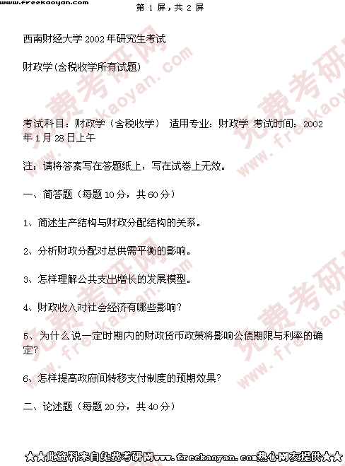 西南财经大学2002年考研真题-财政学(含税收学所有试题)