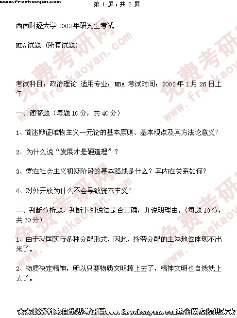 西南财经大学2002年考研真题-MBA试题(所有试题)