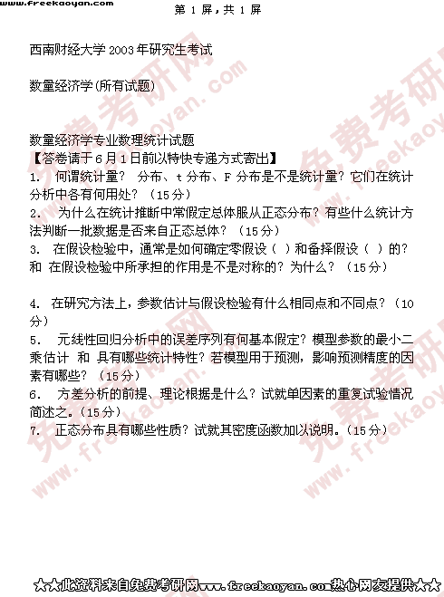 专业课考研经验 本站小编 FreeKaoyan 2018-01-22西南财经大学2003年考研真题-统计学(所有试题)