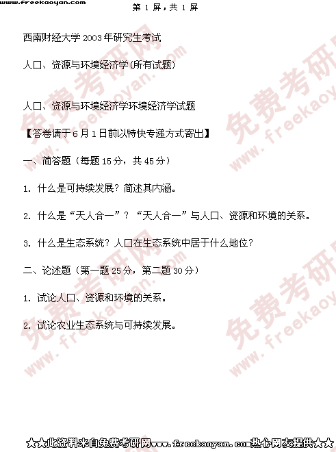 专业课考研经验 本站小编 FreeKaoyan 2018-01-22西南财经大学2003年考研真题-人口学(所有试题)