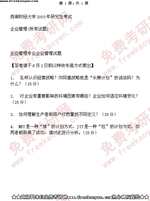西南财经大学2003年考研真题-企业管理(所有试题)
