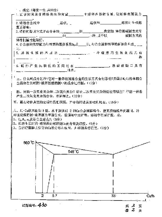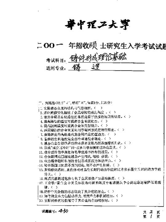 华中科技大学2001年考研真题-铸件形成理论基础