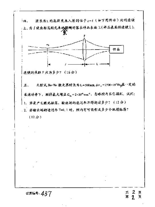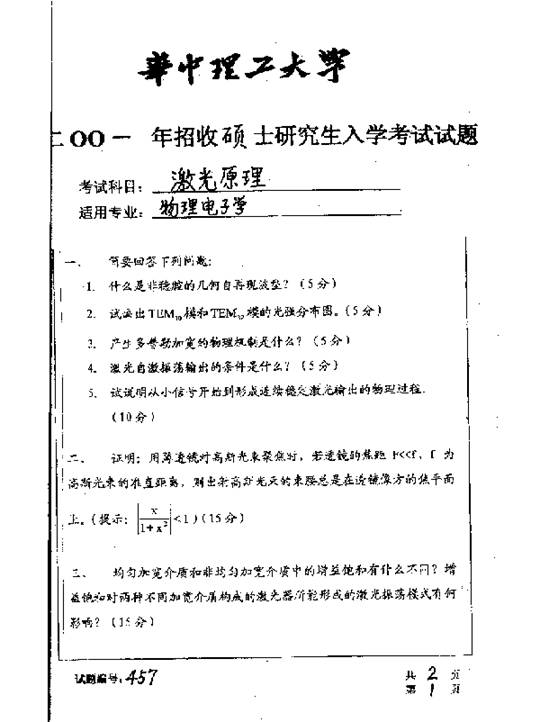 华中科技大学2001年考研真题-激光原理