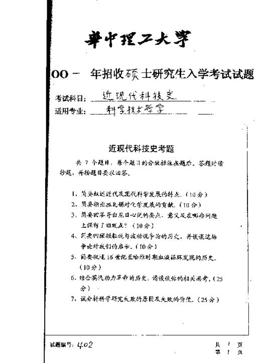 华中科技大学2001年考研真题-近现代科技史
