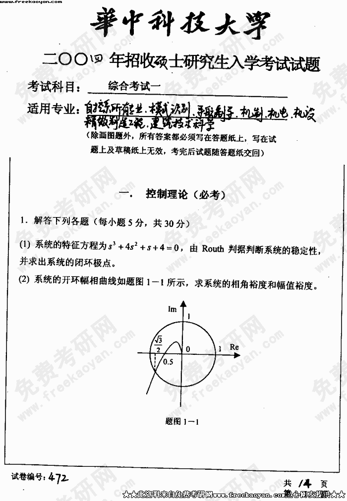 华中科技大学2004年考研真题-综合考试一(自控系所有专业)