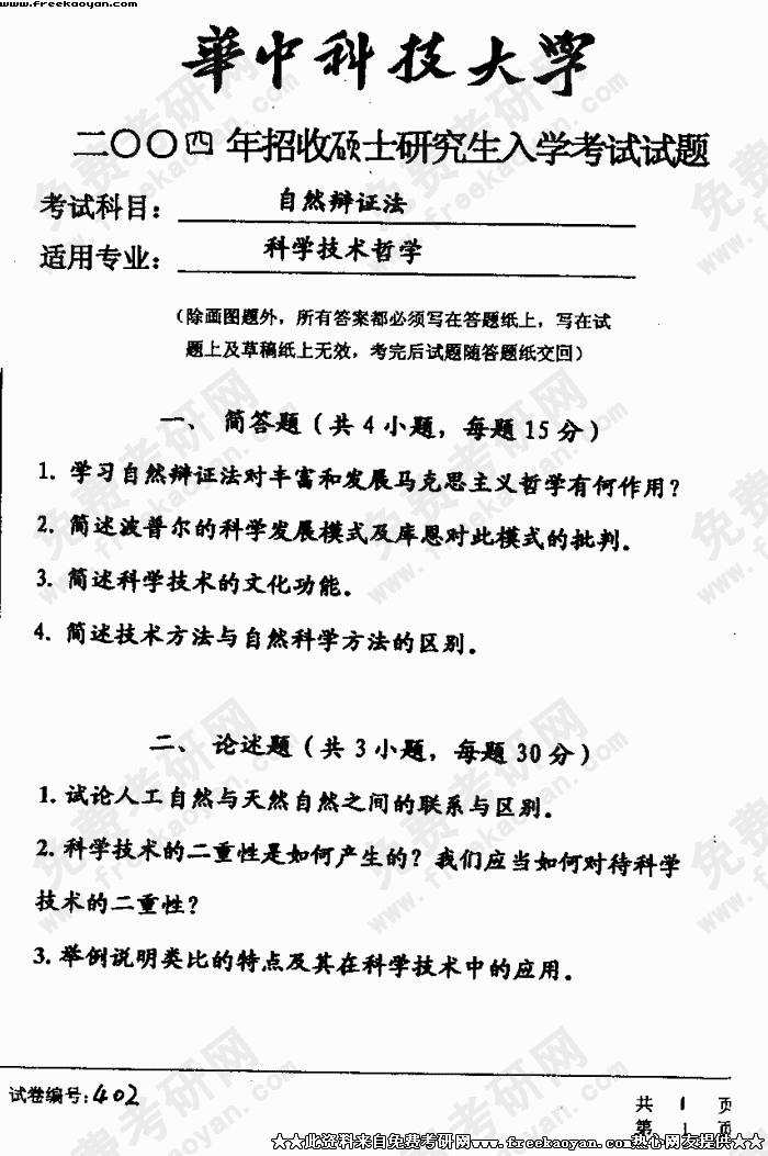 华中科技大学2004年考研真题-自然辩证法试题