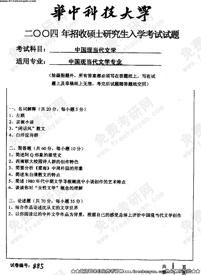 专业课考研经验 本站小编 FreeKaoyan 2018-01-22华中科技大学2004年考研真题-中外文学史试题