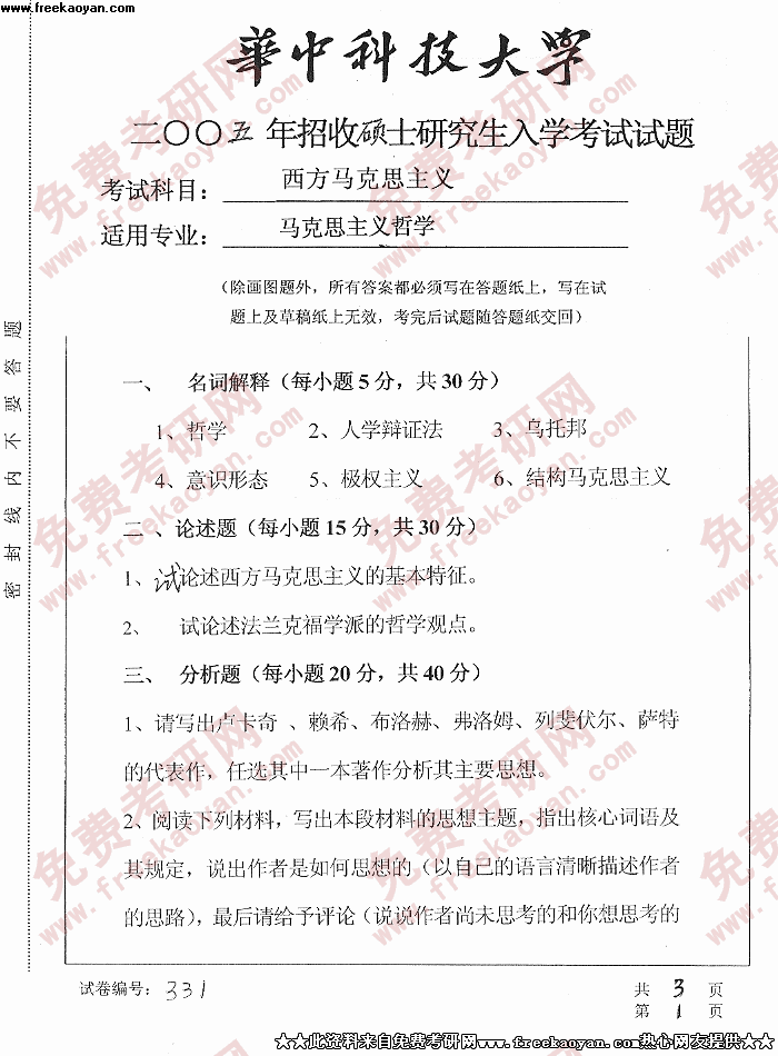 华中科技大学2005年考研真题-马克思主义哲学原理
