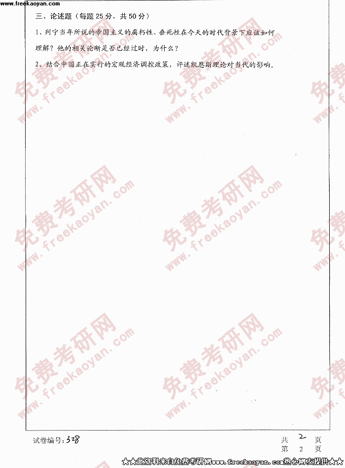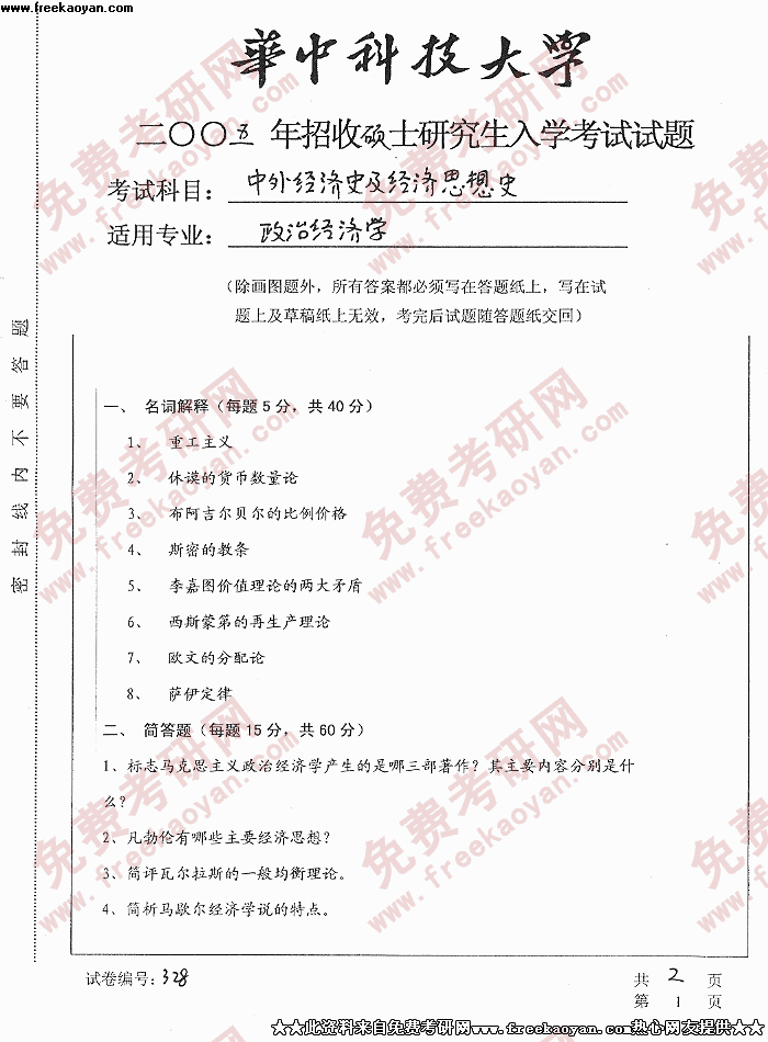 华中科技大学2005年考研真题-中外经济史及经济思想史