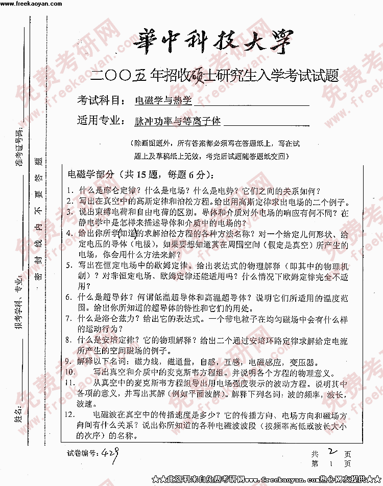 华中科技大学2005年考研真题-《微机原理》《通讯电子线路》综合考试