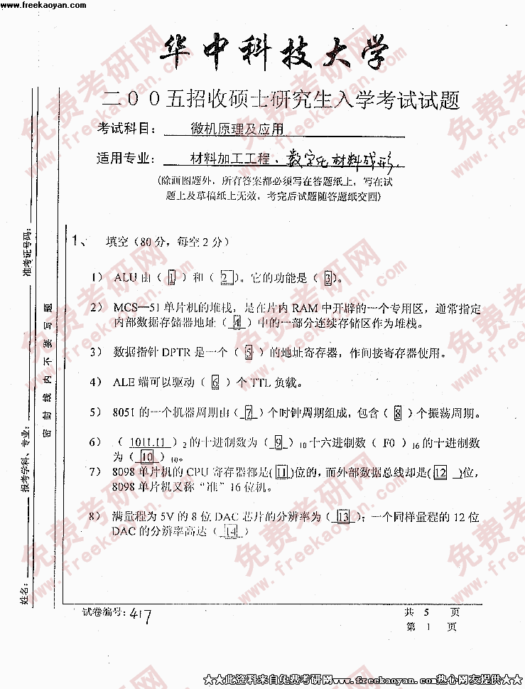 华中科技大学2005年考研真题-材料力学(岩土工程、道路与铁道工程)