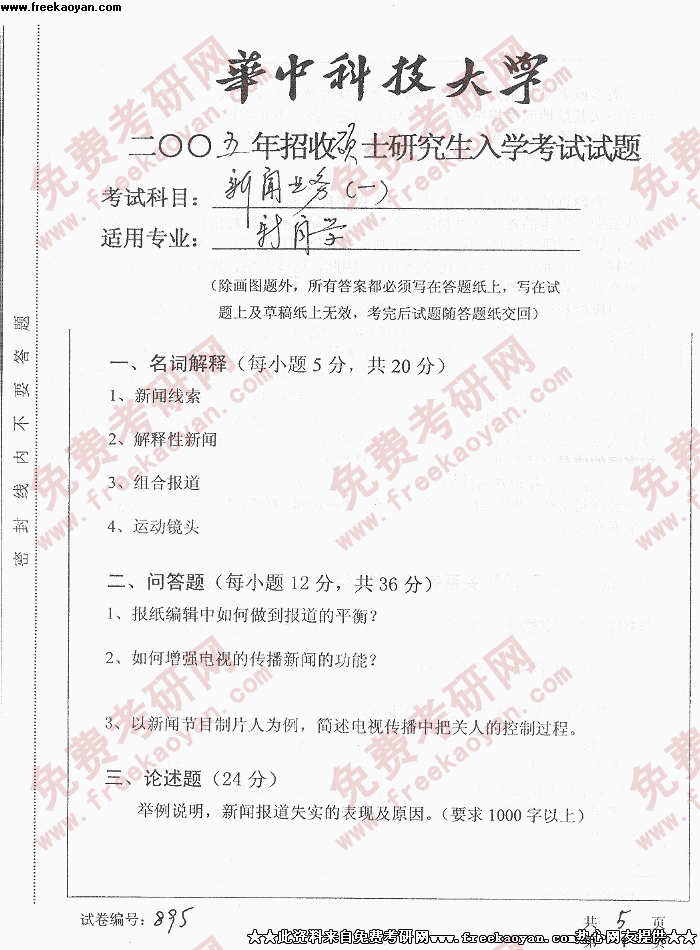 华中科技大学2005年考研真题-材料力学(岩土工程、道路与铁道工程)