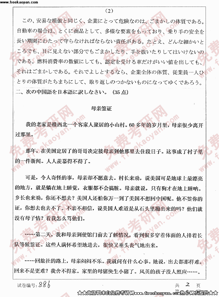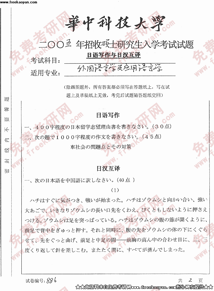 华中科技大学2005年考研真题-日语写作与日汉互译