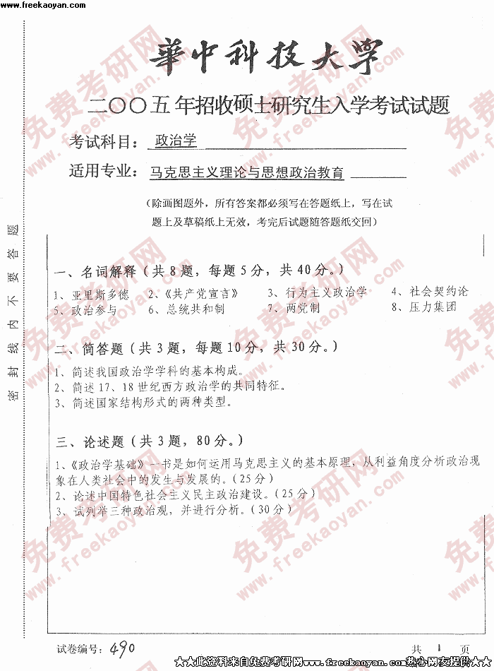 华中科技大学2005年考研真题-政治学