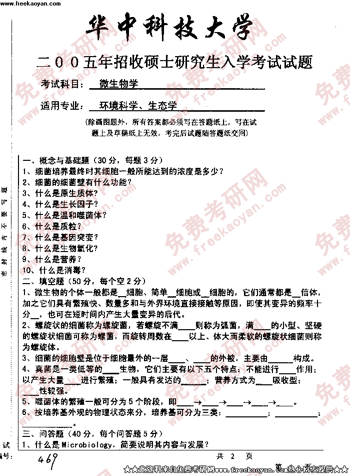 华中科技大学2005年考研真题-微生物学