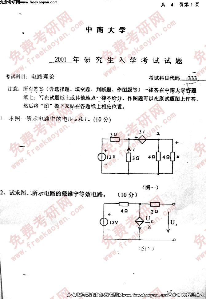 中南大学2001年考研真题-电路理论
