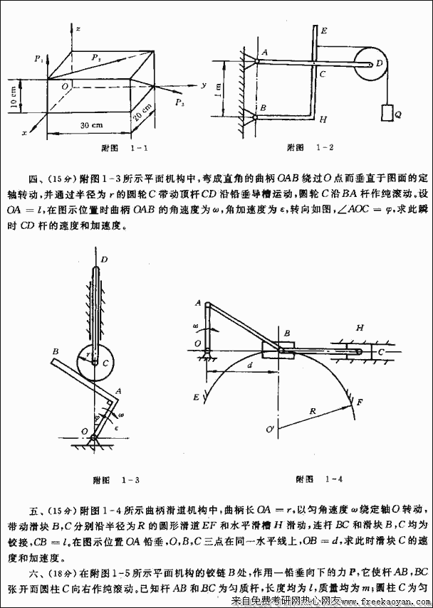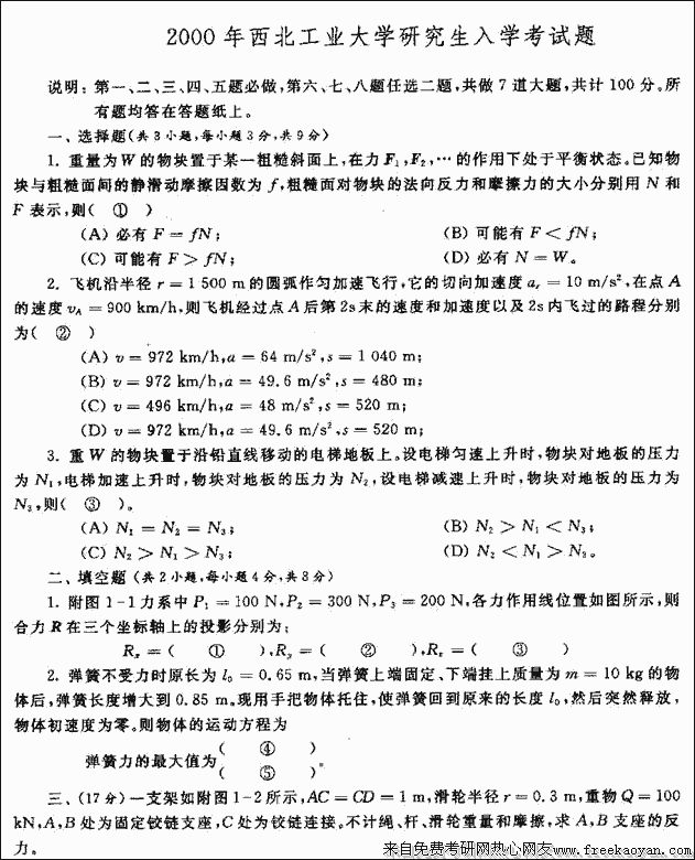 西北工业大学2000年硕士研究生入学考试操作系统试题考试科目:操作系统说明:本试题公共八道大题,满分100)一、填空(本题共12分,每空1分)1、操作系统提供给程序员的接口是___(1)_____.A)进程 B)系统调用 C)库函数 D)B和 C2、设有8页的逻辑空间,每页有1024字,它们被映射到 ...专业课考研经验 本站小编 FreeKaoyan 2018-01-22西安交通大学2000年考研真题-理论力学